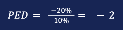 The negative sign reflects the law of demand, but economists usually take the absolute value (you drop the negative sign). Here, PED is equal to 2, meaning demand is elastic: consumers are highly responsive.